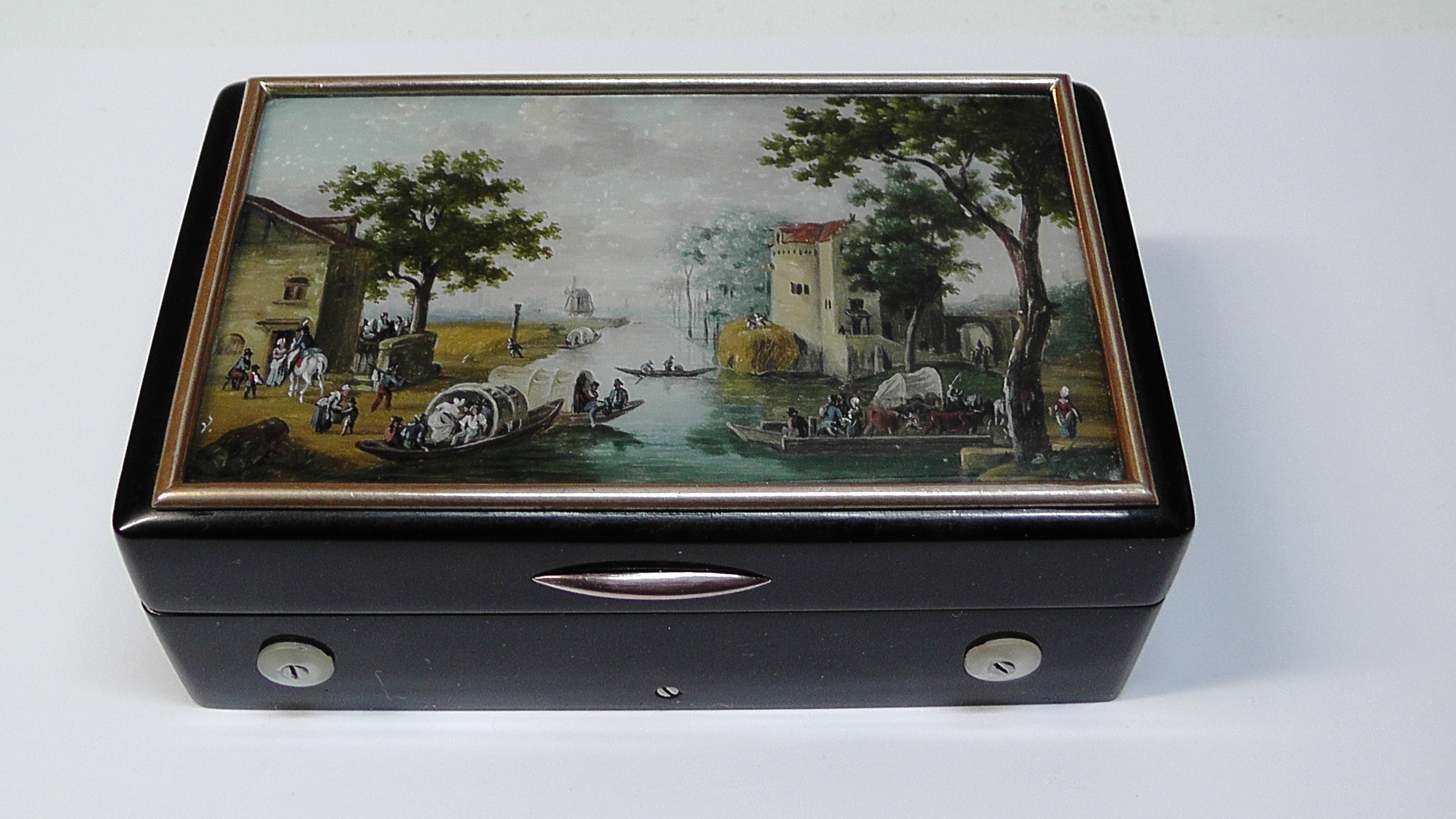 Zwitserse Snuifdoos uit 1835 gemaakt voor de Nederlandse markt (geschilderd op koper). Wie weet waar de afbeelding vandaan komt, dan wel waar het is in Nederland ??