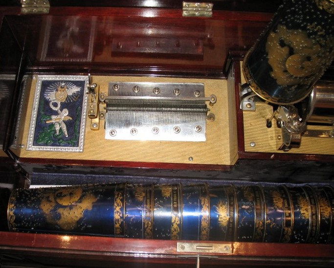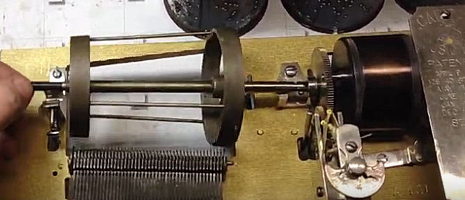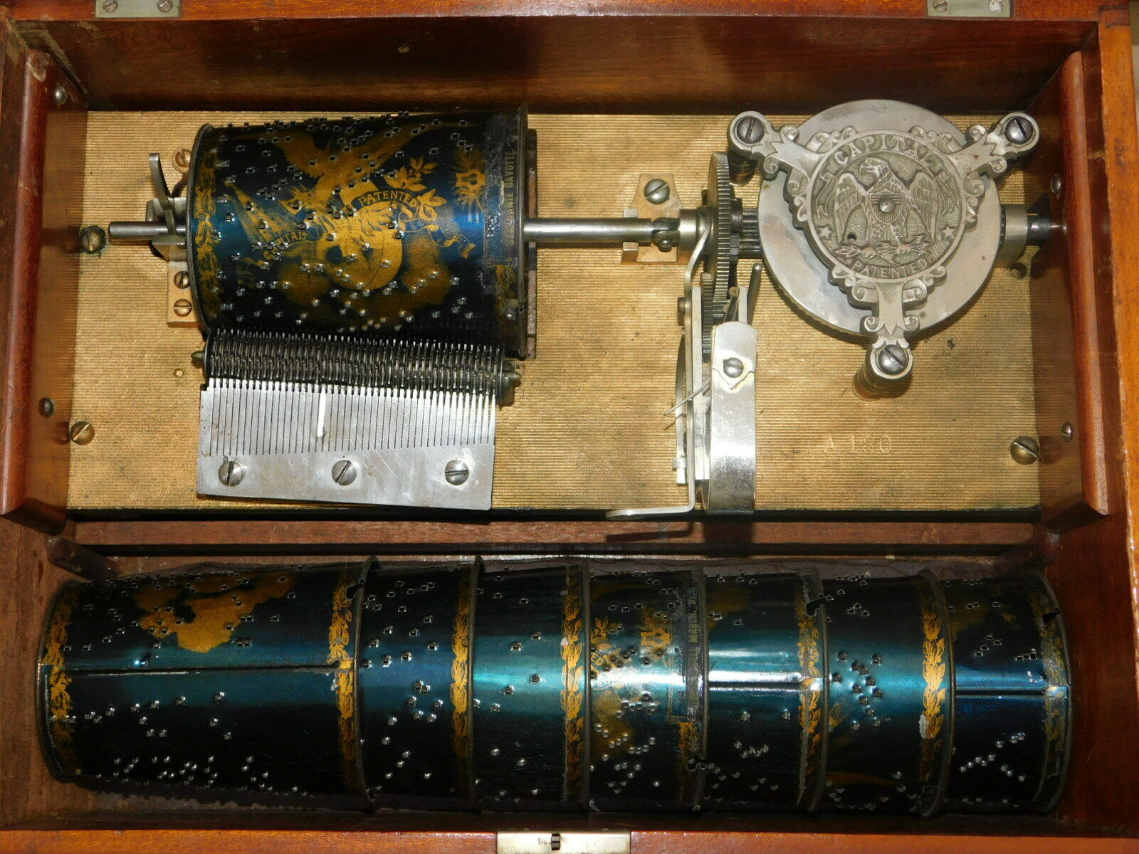 Wat waren nu de bijzondere eigenschappen van dit aparte systeem ? Zo’n Cuff of manchet cilinder werd gemaakt van een dun stuk staal, daarna gevormd tot een metalen conische mouw en potdicht gemaakt door hem onmiddellijk af te koelen. Uiteindelijk geponst, blauw gespoten en van een goudbronzen adelaar voorzien. Voordeel opvallend en uitwisselbaar, maar met een gecompliceerde mandrel (afb. 7). Er kwamen acht verschillende speeldozen in Style O en A tot en met G. Prijzen tussen de US$ 11 en US$ 75. De eerste Style O of nul leek nog enigszins op een cilinder muziekdoos. Het opwind-mechanisme voor de veer zat links en was gebaseerd op het ratel systeem. Verder één kam met 44 tanden en op de doos een voorstelling van een zittende vrouw in een landschap. De volgende series werden allemaal rechts voorzien van een slinger en kregen op de binnenkant doos een voorstelling van een landschap met een beek en boerderij. Style F was er één met twee kammen en totaal 162 tanden (zie afb. 4). Een verkoopargument was de extra speelduur van de cilinder in vergelijking met de platenspeeldozen. De innovatie was een langere veer. De manchet werd in beweging gebracht door één set tandwielen. Uiteindelijk kwamen er drie soorten Cuffs voor kammen met 44, 58 en 81 tanden. Onderaan de cilinder stond de titel. Er werden voor zover bekend 417 melodieën uitgebracht. Ook kon een citer-element als accessoire worden bijbesteld voor $ 1. Style D,E en G werden voorzien van een muntautomaat. Twee melodieën voor één penny of één nickel. Specificaties zie onderaan.